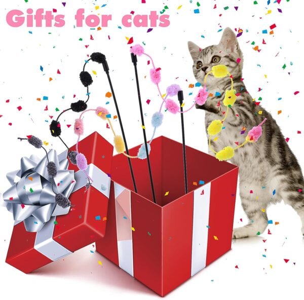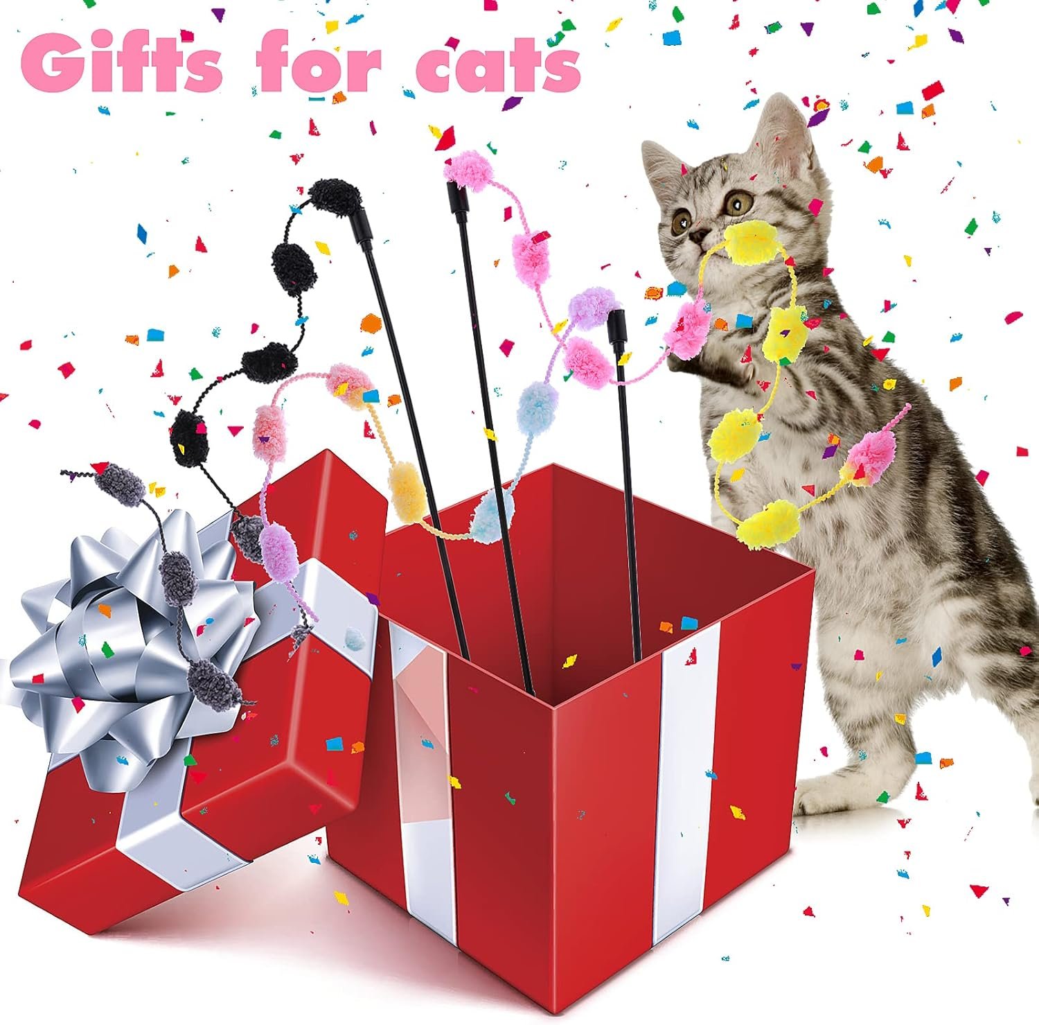 - Perfect Gift for the Cat rs: This cat stick toy is composed of many bright colors which are very beautiful & light and bounce so cat-teasing is an enjoyable job for you. You can shake the wand when sitting on the couch watching TV, your little cats will be excited because of the rainbow ribbon. Teasing cats with these kitten toys also improve the relationship between you and your pets.